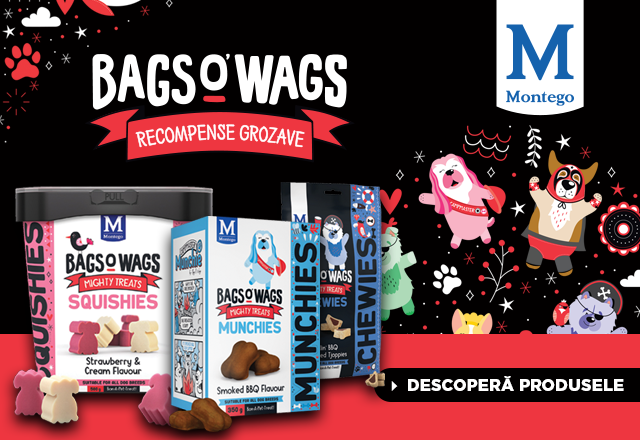 - Bags O’ Wags – recompense gustoase, ideale pentru antrenament și răsfăț zilnic, disponibile în diverse texturi și arome;