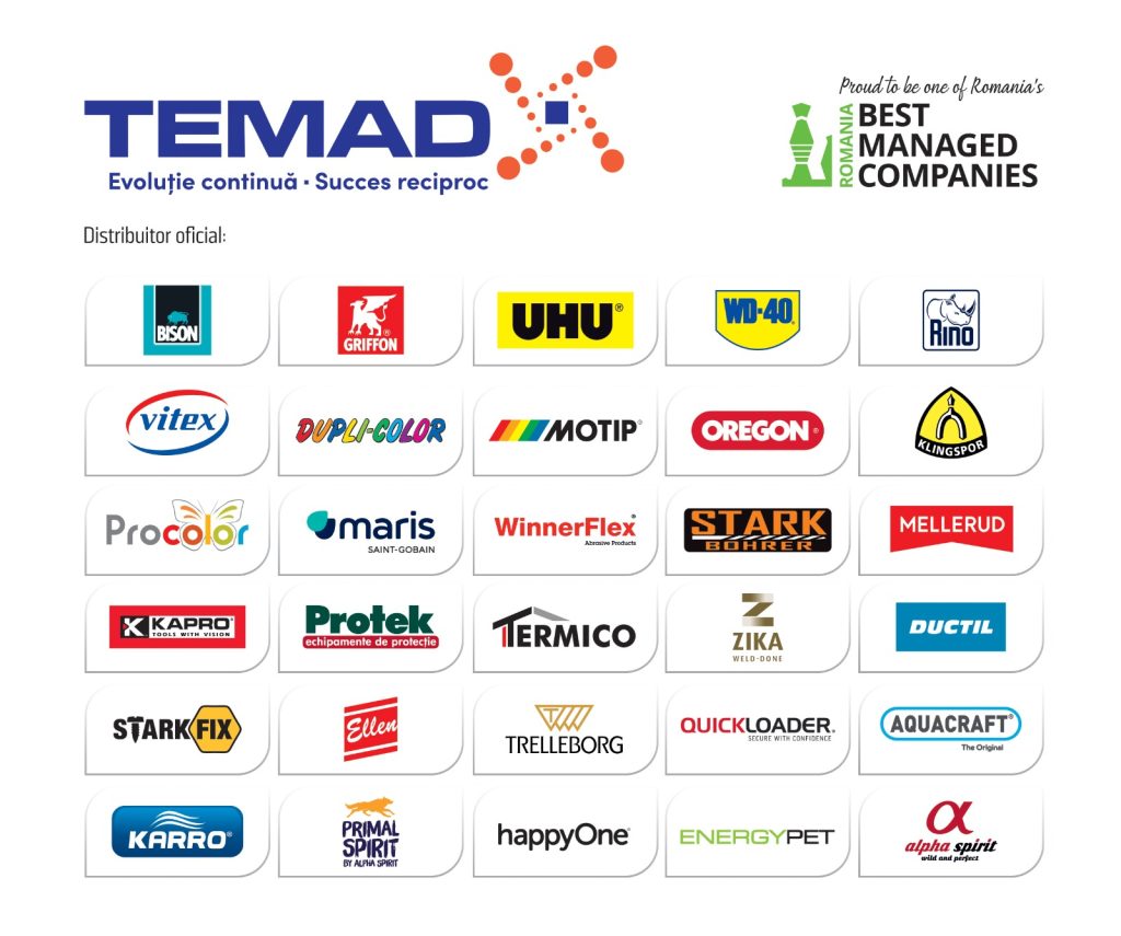 Fondată în 1994, TEMAD CO SRL, cu o cifră de afaceri în 2025 de 52 mil euro, a crescut constant, devenind unul dintre cei mai importanți distribuitori de materiale auxiliare pentru construcții, adezivi, etanșanți, lubrifianți, vopsele lavabile, vopsele pentru retuș auto, soluții pentru hidroizolații, spray-uri tehnice, echipamente de protecție, accesorii pentru zugrăvit, articole pentru grădinărit și domeniul forestier și multe alte soluții premium pentru întreținere.